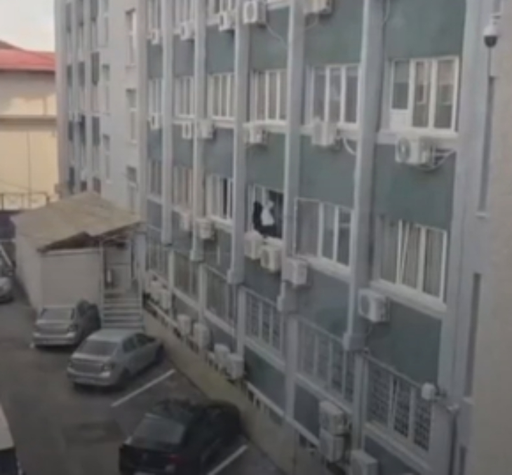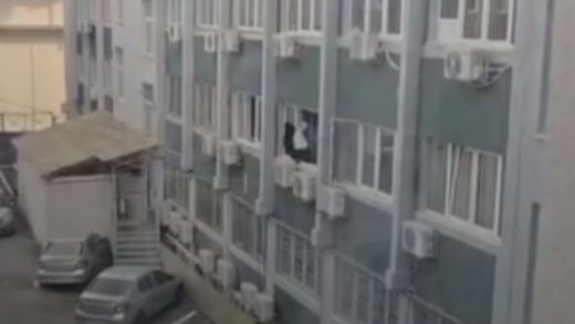Imaginile surprind o persoană în uniformă, aplecată în exteriorul ferestrei, în timp ce încearcă să curețe partea din afară a geamului, fără mijloace vizibile de protecție.